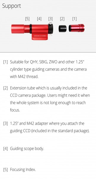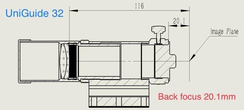 Der Anschluss der Kamera oder des Autoguiders ist problemlos. Durch Verdrehen des Objektives kann der Fokusabstand von 0 mm bis über 25 mm ab dem T2-Gewinde eingestellt werden. Damit können Sie viele CCD- oder CMOS-Kameras mit T2-Anschluss, alle Autoguider mit 1,25"-Gehäuse und natürlich auch 1,25"-Okulare verwenden. Für Autoguider wie z.B. die ZWO ASI120 Mini muß die 1,25"-Verlängerung, die mit der Kamera geliefert wird, verwendet werden.