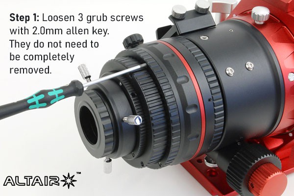 Anweisungen zum Anbringen des M92 Reducer oder Flattener am Altair Okularauszug - siehe Bilder oben: