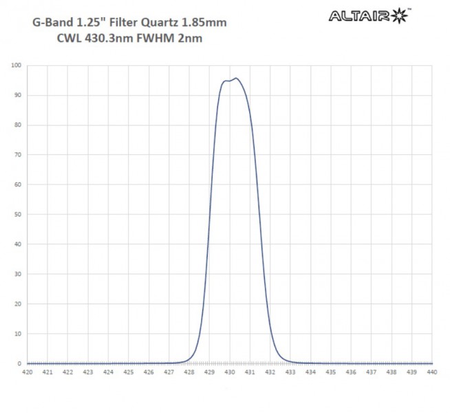 UV-, IR- und visuelle Wellenlängen werden blockiert, und nur ein ultraschmales 2nm FHWM-Blauband bei 430,3nm wird an Ihre Kamera übertragen. Dadurch wird der Kontrast von Sonnenmerkmalen bei der Beobachtung oder Abbildung mit einer Farb- oder Monokamera deutlich erhöht, und es werden mehr Details in der Sonnenphotosphäre sichtbar.