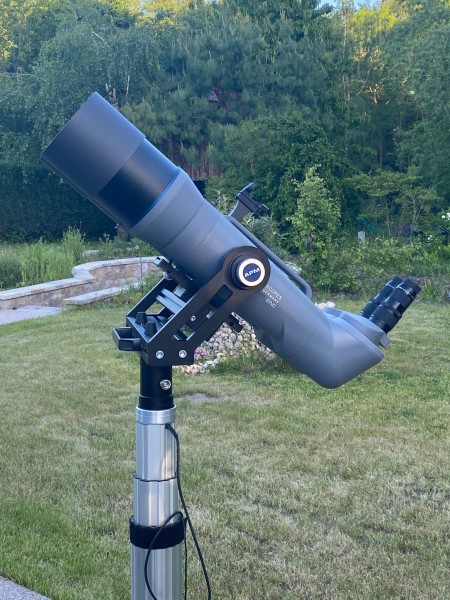 Die Ausführung mit 90° Einblick wurde gewählt um alle Höhenbereiche des nächtlichen Himmels komfortabel abdecken zu können. Dieses Gerät ist kein Spielzeug und daher auch für die sehr ernste astronomische Arbeit vollends geeignet. Unser Bino ist mit 2" Okulaaufnahmen ausgestattet, also universell bei der Wahl der Okulare.