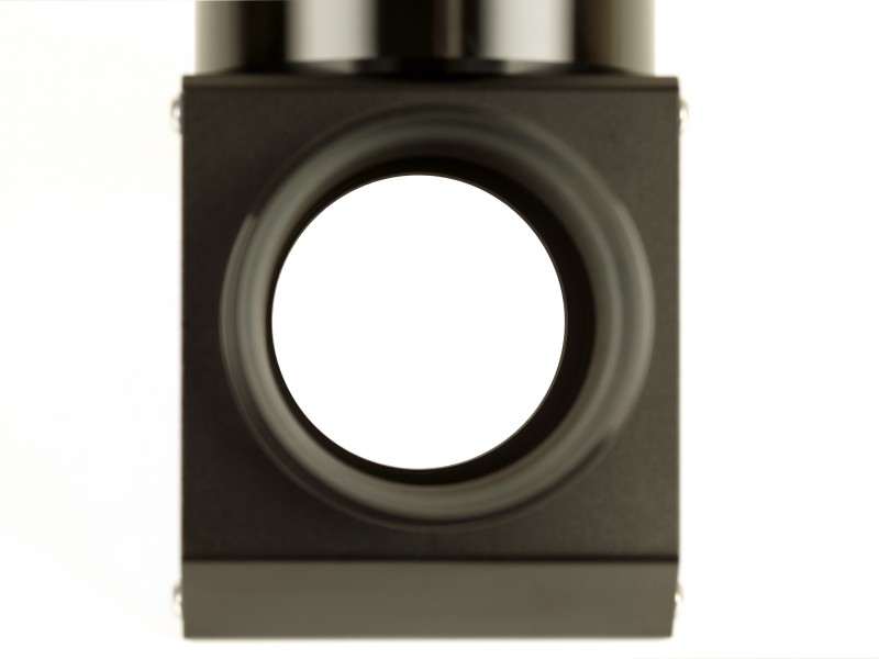 Das stabile Gehäuse ist präzise CNC-gefräst. Das Zubehör wird mit der modernen 2" APM-Schnellklemme (Q-Lock) sicher gehalten. Dabei wird das okularseitige Zubehör über die gesamte Fläche mittels Ringklemmung festgehalten. Im Gegensatz zu Klemmschrauben wird dadurch das Okular oder der Adapter genau auf der optischen Achse zentriert und nicht an die gegenüberliegende Fläche gedrückt. Der vordere 2" Steckadapter ist abschraubbar und verfügt über das bekannte 2" SC -Gewinde