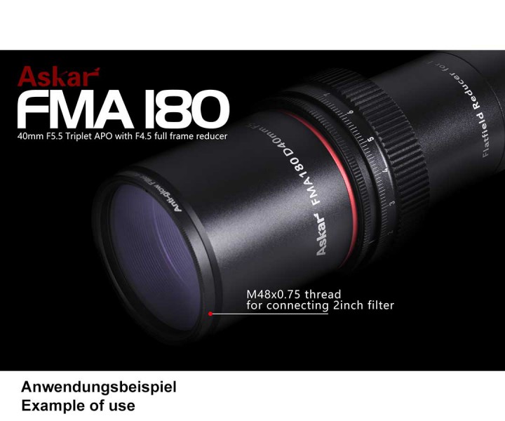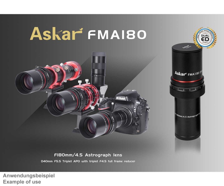 Der FMA180 von Askar ist ein fast farbreiner Triplet-APO-Refraktor mit zwei ED-Sondergläsern für eine ausgezeichnete Korrektur. Die hochwertige Optik erzeugt ein nahezu farbreines sowie kontrastreiches Bild und erfüllt auch hohe Ansprüche im Bereich der Astrofotografie und auch Beobachtung.