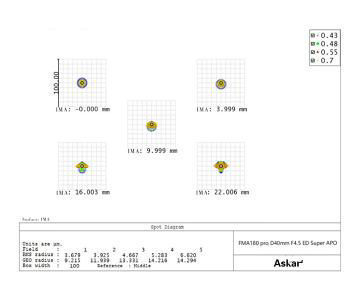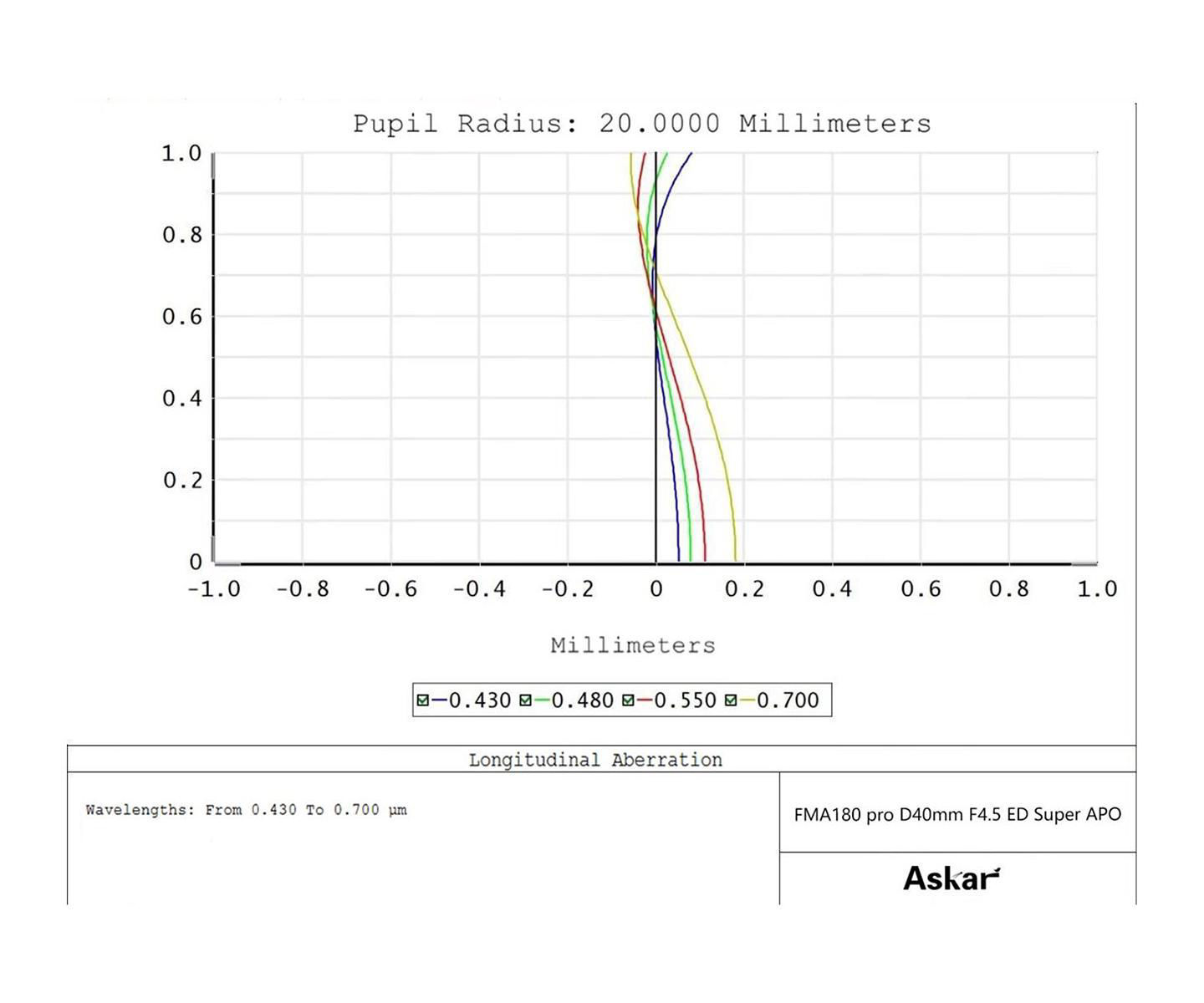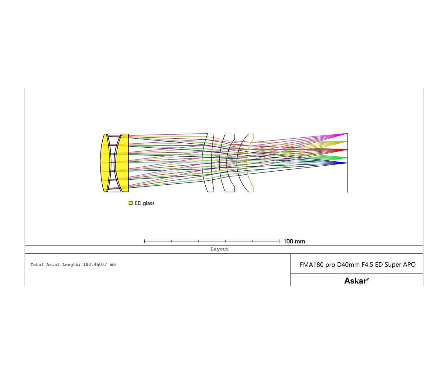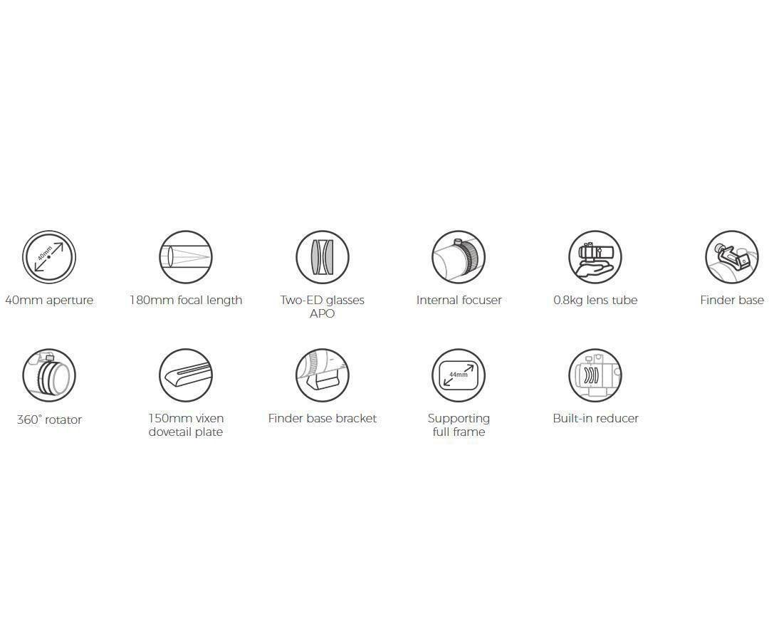 Um den Nutzern mehr Möglichkeiten zu bieten, hat Askar den FMA180 pro eingeführt.Ähnlich wie der FMA180 verfügt der FMA180 pro über ein Sextuplet-APO-Design mit drei vorderen und drei hinteren Linsen, von denen zwei aus ED-Glas bestehen, das eine hervorragende Korrektur der chromatischen Aberration bietet und damit die Grundlage für hochwertige Astrofotografie und Beobachtung schafft. Er hat eine Öffnung von 40 mm, ein Öffnungsverhältnis von f/4,5 und eine Brennweite von 180 mm.