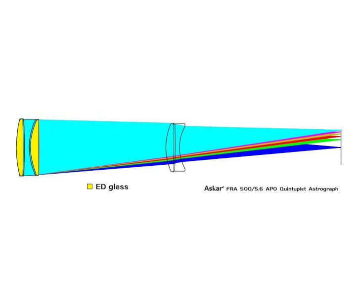 Der ASKAR FRA500 ist ein 5-Element-Apochromat nach Petzval mit 500mm Brennweite, f/5.6 und 90mm Öffnung. Im Objektiv sind 2 ED-Gläser verbaut für eine gute Korrektur des Farbfehlers. Der Apo ist korrigiert für Kameras bis Vollformat.
