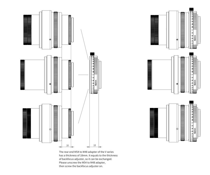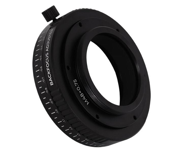 Bei der Astrofotografie hat der Arbeitsabstand einen großen Einfluss auf die Qualität der Abbildung. Ein präzises Einstellen ist daher wichtig. Um dies zu vereinfachen, hat ASKAR den "Backfocus Adjuster" entwickelt. Bei einer mittleren Länge von 18 mm kann der Arbeitsabstand um ± 2 mm eingestellt werden. Es gibt zwei Modelle des Adapters, einen mit M48-Gewinde auf der Kameraseite und einen mit M54. Auf der Teleskopseite haben beide Ausführungen ein M54-Gewinde.