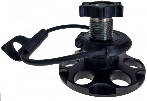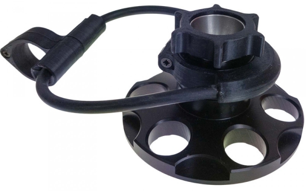 Das Gewinde hat einen Verstellbereich von 25 mm. Die Befestigung am Stativ erfolgt über einen Rundgummi.