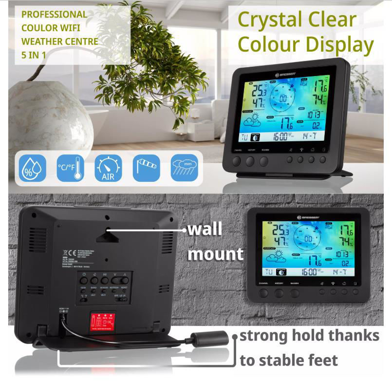 Holen Sie sich mit der BRESSER WLAN-Farbwetterstation mit 5-in-1-Profi-Sensor Ihren eigenen Wetter- und Raumklima-Experten nach Hause.