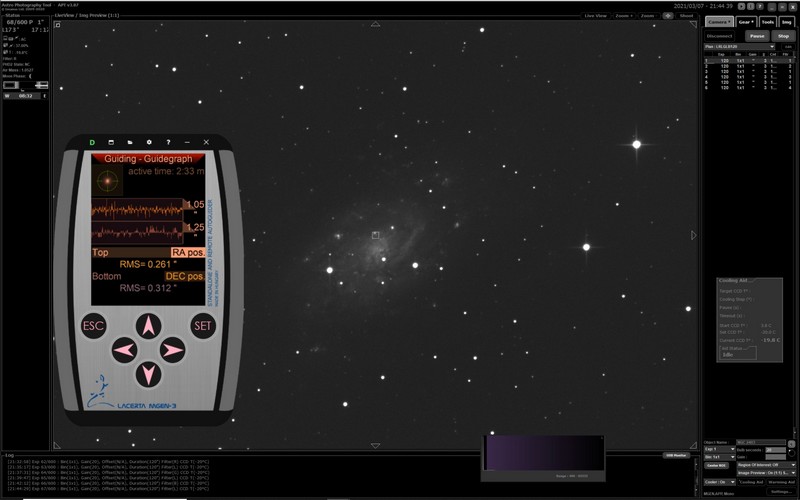 Der verwendete Guiding Chip (CMOS AR0130CS mono) des Lacerta MGEN-3 Standalone-Autoguider ist sehr empfindlich. Am 9x50-Sucher kann man so leicht auf bis zu 13mag helle Sterne bei 1 s Integrationszeit guiden bei einem Feld von über 1,5° Diagonale!