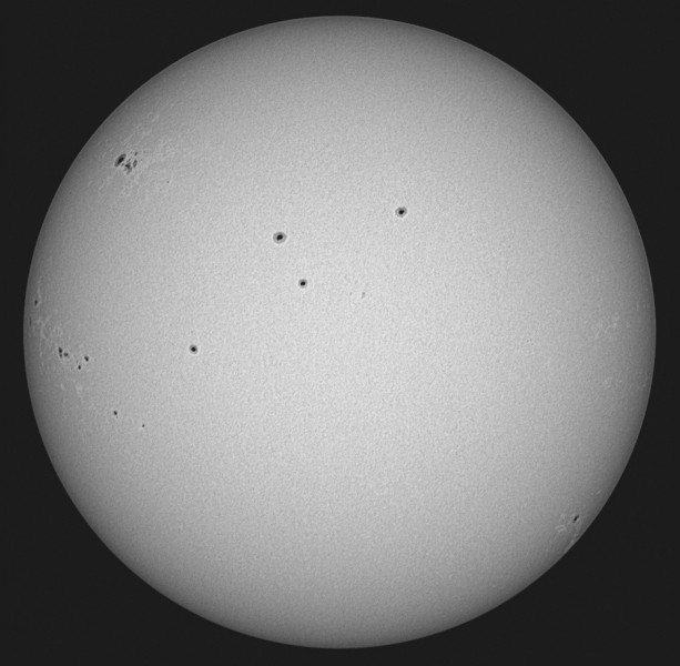 Für die Beobachtung der Sonne sind natürlich 5% Durchlass zu viel. Sie brauchen unbedingt Lichtdämpfungsfilter. Da der Herschelkeil polarisiertes Licht produziert, genügt ein einfacher Polarisationsfilter, der in das Okular oder in den Fotoadapter eingeschraubt wird. Durch Verdrehen wird die Helligkeit reduziert. Mit Graufiltern und dem Baader Solar Continuum Filter können Sie die Helligkeit weiter auf das gewünschte Maß reduzieren und den Kontrast beeinflussen.
