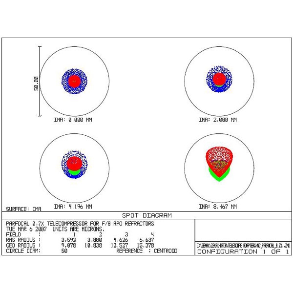 Das optische Design des NexGen 0,7x wurde mit ZEMAX optimiert für bestmögliche Sternabbildung zwischen 450 und 650 nm. Das Ziel war der kleinstmögliche Sterndurchmesser.