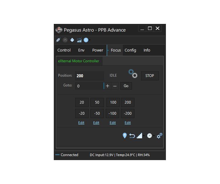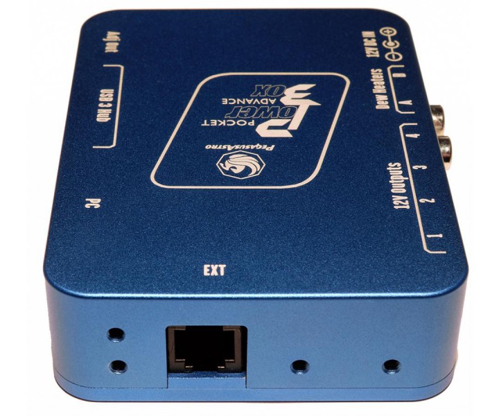 EXT-(Erweiterungs)-Anschluss ist für die Geräteerweiterung verfügbar. Diese RJ12-Buchse ermöglicht den Anschluss aktueller und zukünftiger Pegasus Astroprodukte. Angeschlossene Geräte können über die eigenständige Pocket Powerbox Advance-Software oder einen dedizierten ASCOM-Treiber gesteuert werden.