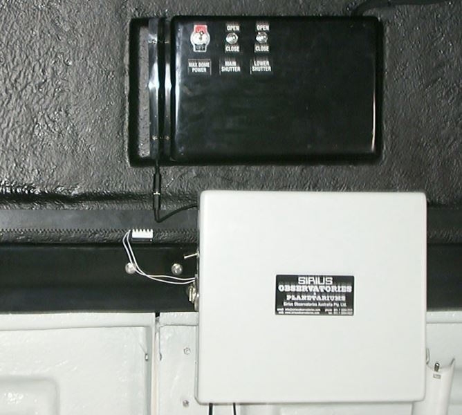 Das obere Kuppeltor wird ebenfalls über einen Motor und eine 12V-Batterie geöffnet und geschlossen. Beide Kuppeltore können unabhängig voneinander geöffnet oder geschlossen werden. Die Batterie sowie die Kupplung und der Motor sind in einem fixen Gehäuse an der Kuppel selbst angebracht. Mittels eines Schalters, kann das obere Kuppeltor ganz oder aber auch nur teilweise geöffnet werden. Die Batterie kann ebenfalls mit der Solarpanele verbunden und so automatisch am Tag aufgeladen werden.