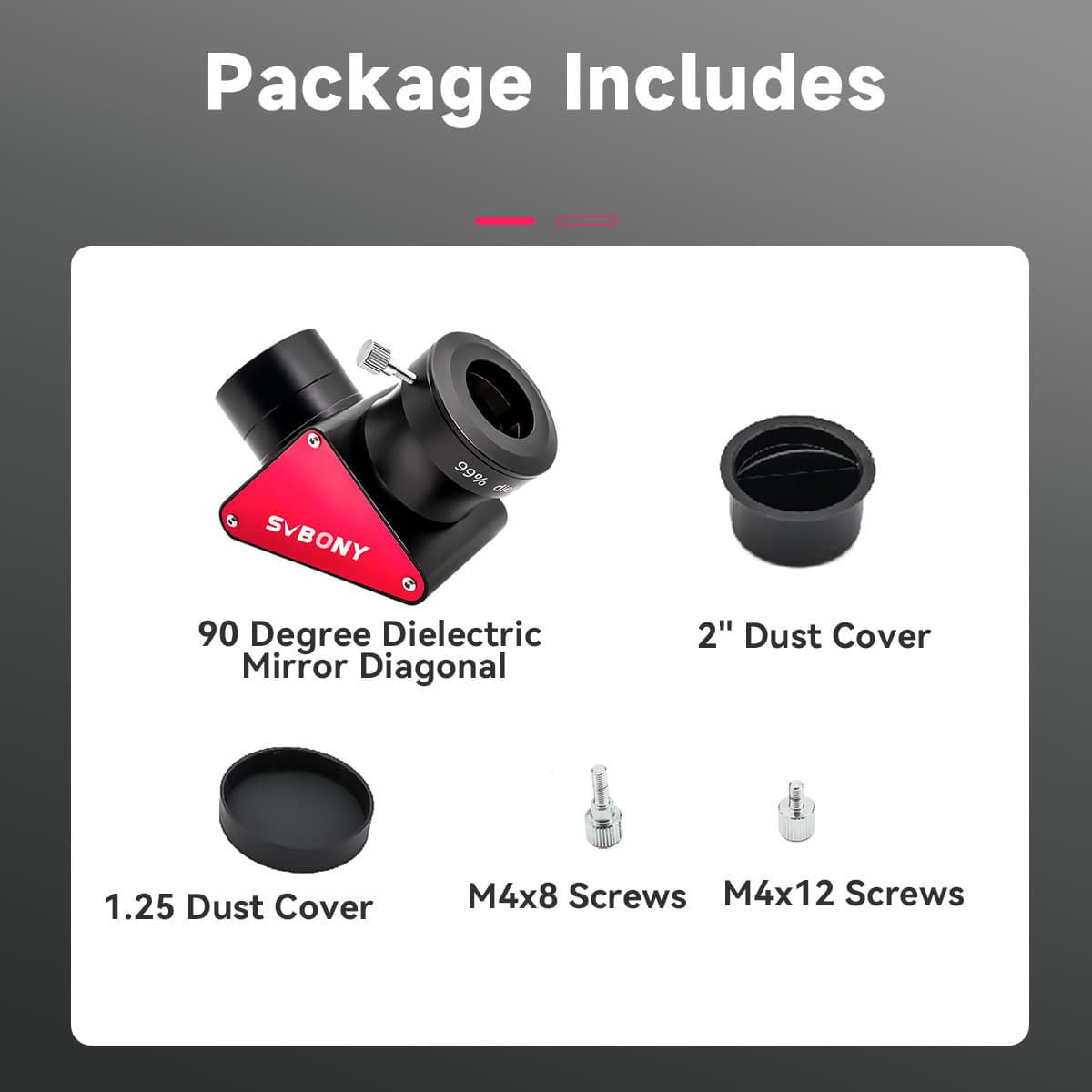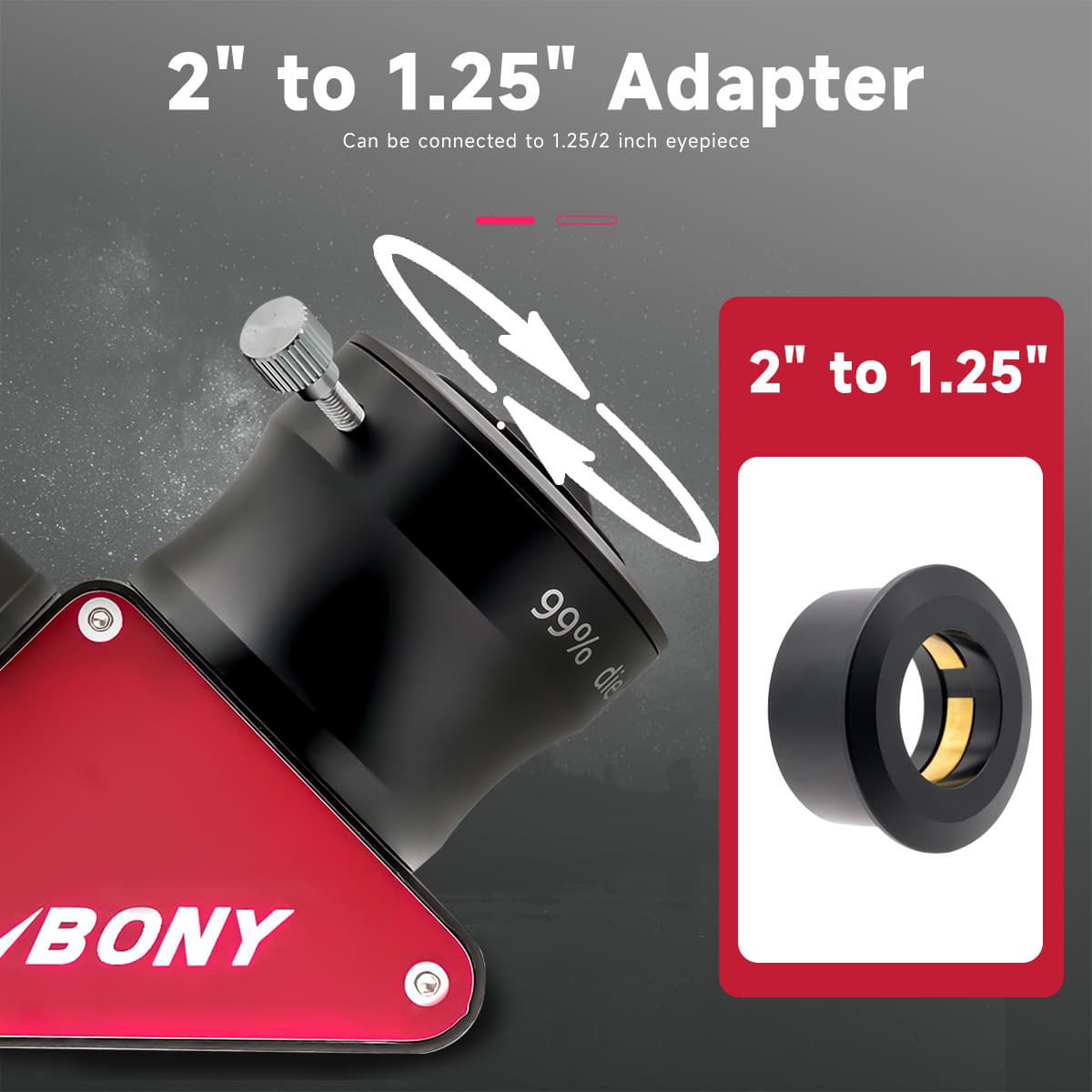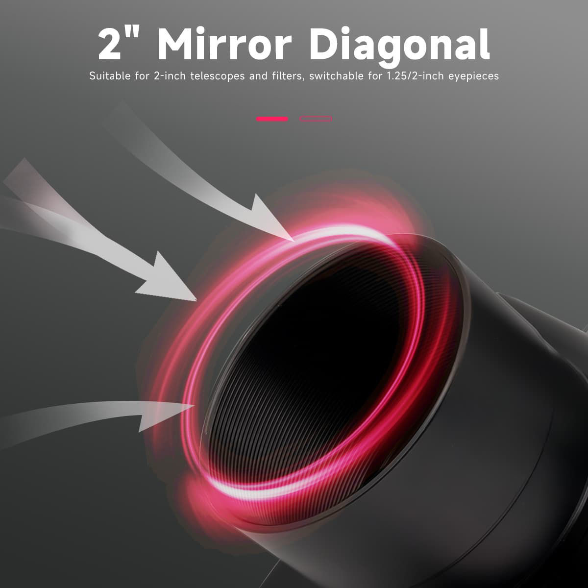 90° Betrachtungswinkel: Der Diagonalspiegel reflektiert den Lichtweg im Teleskop um 90 Grad, was das Beobachten von Objekten im Zenit (also hoch am Himmel) deutlich komfortabler macht. - Anschlussgröße: Es gibt Versionen für 1,25 Zoll Okulare; laut Herstellerangabe auch Varianten mit 2 Zoll.
