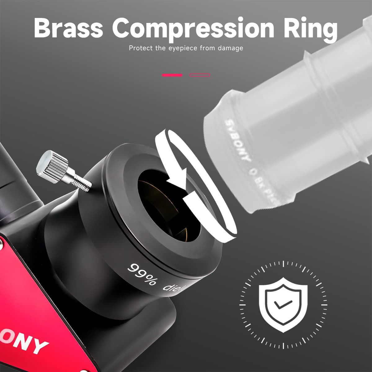 - Mechanik & Aufbau: Metallgehäuse aus Aluminium-Legierung, Kompressionsring aus Messing zur sicheren Fixierung des Okulars, Gewinde zur Nutzung von 1,25″ Filtern.