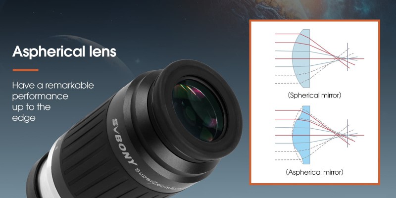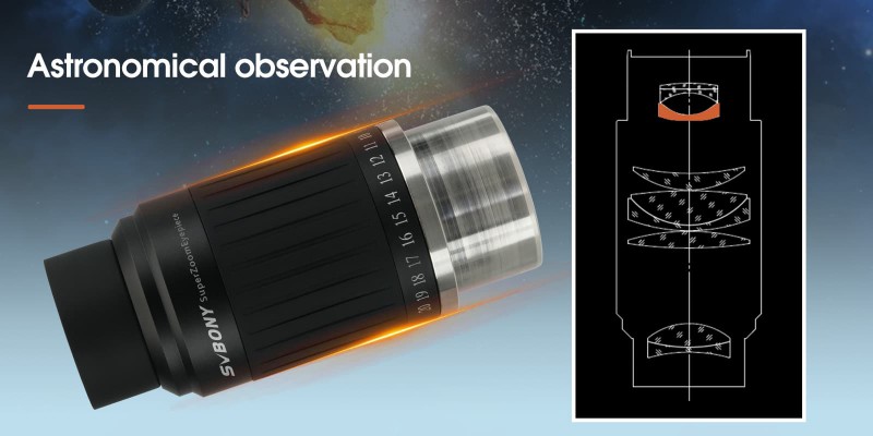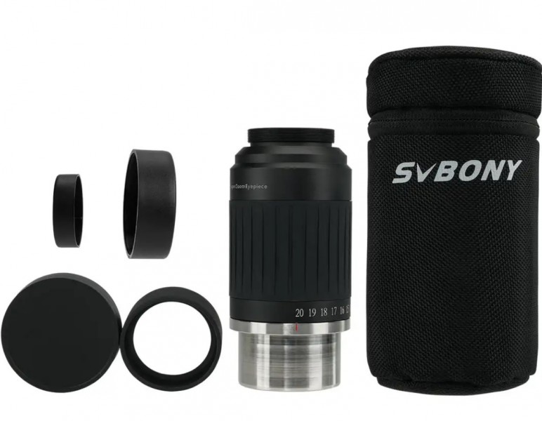 Das SV230 ist ein asphärisches Superzoom-Okular mit einer Brennweite von 8 mm bis 20 mm und einer Klick-Stopp-Einrastung. Das Okular hat ein scheinbares Gesichtsfeld von 55°-75° und bietet höchsten Beobachtungskomfort. Es unterstützt auch den Anschluss eines Astigmatismuskorrektors. Der große Augenabstand von 17-19 mm ermöglicht eine bequeme Beobachtungsposition auch für Brillenträger. Es kann sowohl bei Tag als auch bei Nacht verwendet werden und bietet eine hervorragende Auflösung und Kontrast sowie ein scharfes Bild mit einem großen scheinbaren Gesichtsfeld. Die Planetenbeobachtung mit dem SV230-Okular ist nicht nur äußerst komfortabel, sondern auch von hoher Qualität, da es klare und unverzerrte Bilder ohne Randverzerrung liefert. Für grossflächige DeepSky-Beobachtungen eignet sich das Okular ebenso.