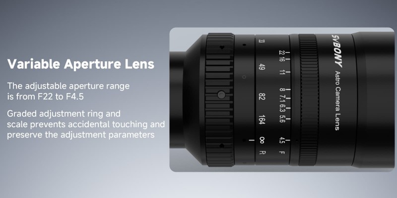 SV555 Astrofotografie-Teleskop-Kamera-Objektiv kann die Blende von F22 bis F4,5 eingestellt werden. Das professionelle Astrofotografie-Objektiv verfügt über einen Einstellring und eine Skala. Die eingestellten Parameter bleiben auch bei versehentlicher Berührung unverändert.
