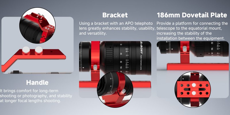 Das SV555 APO Astro-Kameraobjektiv ist mit einem Griff, einer Halterung und einer Schwalbenschwanzplatte ausgestattet, die die Handhabung des Objektivs während der Aufnahme erleichtern. Das APO-Teleobjektiv verfügt über einen arretierbaren 360°-Rotator und einen drehbaren Objektivtubus, mit dem sich der Bildwinkel bequem einstellen lässt. Ob für alltägliche Aufnahmen oder für die Astrofotografie, Sie finden immer den richtigen Winkel für den optimalen Bildeffekt.