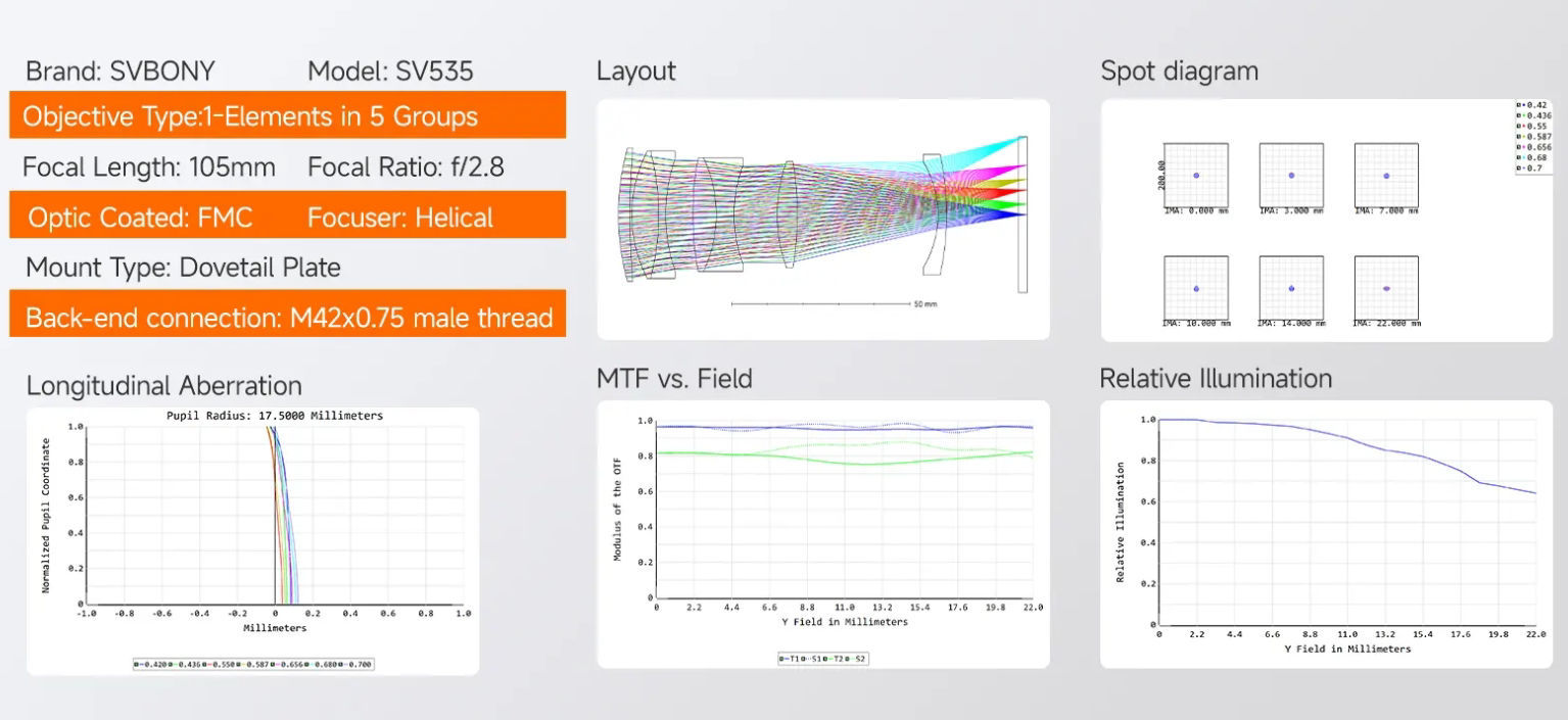 | Modell | SV535 | | Objektivtyp | 7 Elemente in 5 Gruppen | | Brennweite | 105 mm | | Öffnungsverhältnis | f/2,8 | | Vergütung | FMC (Fully Multi-Coated) | | Fokussierer | Helikal | | Montage | Schwalbenschwanzplatte (Dovetail) | | Anschluss (Rückseite) | M42 × 0,75 Außengewinde | | Gewicht | ca. 1500 g |