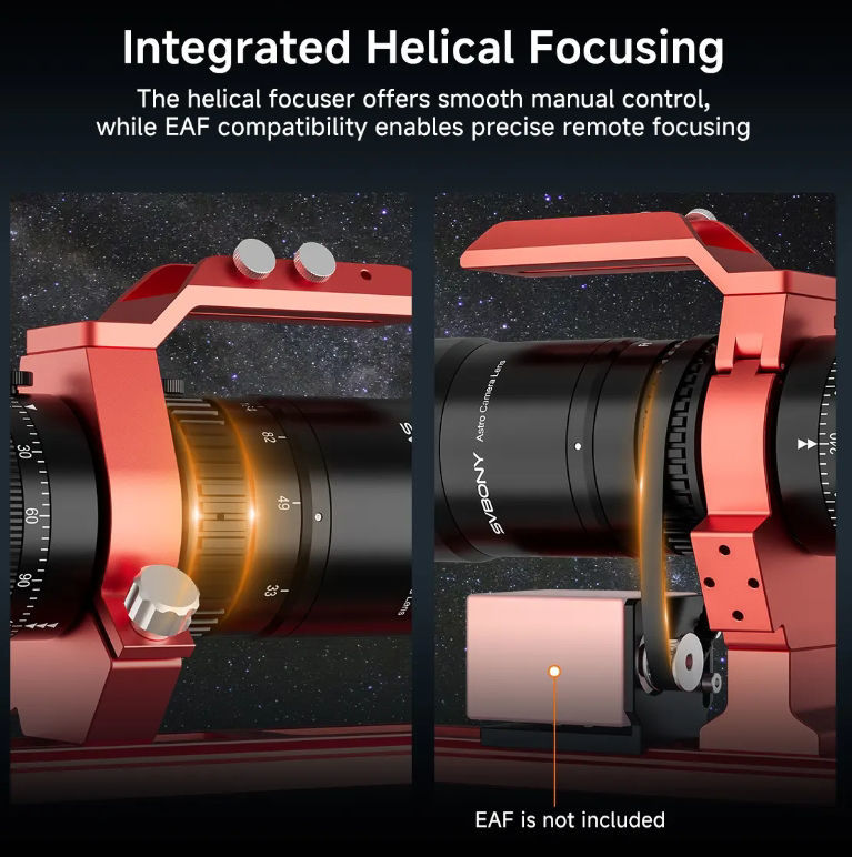 Der einteilige Helikalfokussierer ist bereits für die Montage eines elektronischen Autofokus (EAF) vorbereitet. So wird eine präzise, automatisierte Feinjustierung beim Imaging ermöglicht – im Gegensatz zu separaten manuellen Fokussiersystemen.