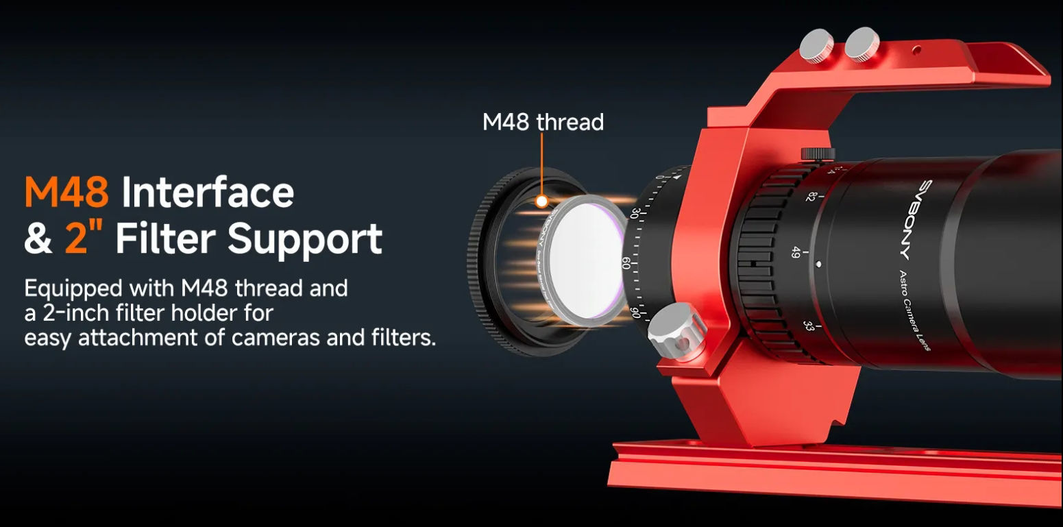 Mit standardisierten Gewindeanschlüssen und großzügigem Backfokus lässt sich das System nahtlos mit DSLRs, Astro-Kameras und Filterrädern verbinden – für eine schlanke Imaging-Kette ohne zusätzliche Adapter.