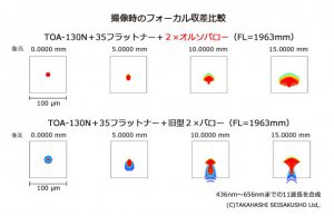 Um seine Okulare und Barlow-Linse zu entwerfen, arbeitet Takahashi immer an der gesamten optischen Kette, angefangen bei einem aberrationsfreien Objektiv (in der Regel ist die Referenz das apochromatische Triplet der TOA-Serie), bis zum Auge oder den Sensor; das Ziel ist keine zusätzliche Abweichung hinzuzufügen oder sogar einige der Fehler in des Objektivs zu korrigieren. In der Tat erzeugt die Kombination der Ortho Barlow-Linse mit den Okularen der TPL-Serie ein besseres Bild, entweder in der Mitte des Feldes oder an der Peripherie, als wenn das Barlow nicht verwendet wird! In der Bildmitte kompensiert die Linse sogar die sehr schwache chromatische Aberration des TOA-Objektivs.