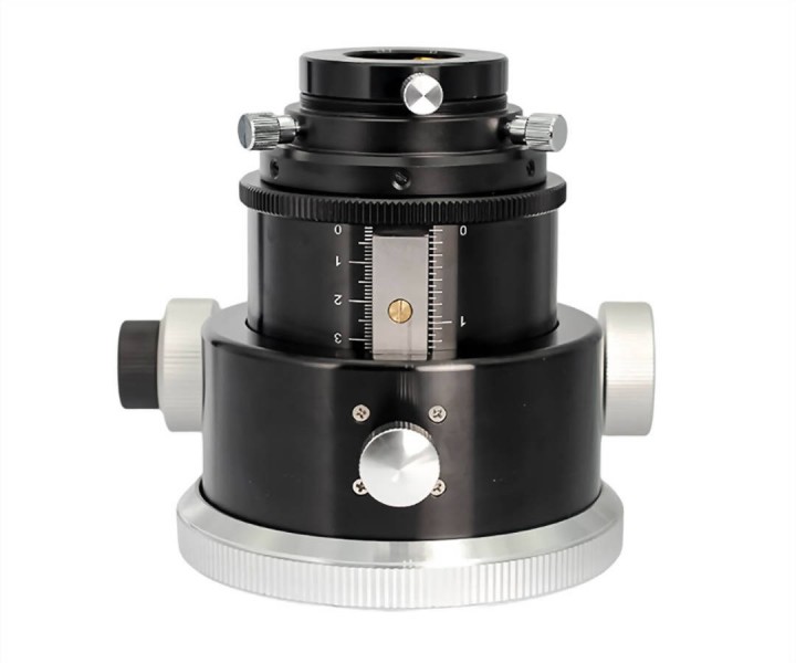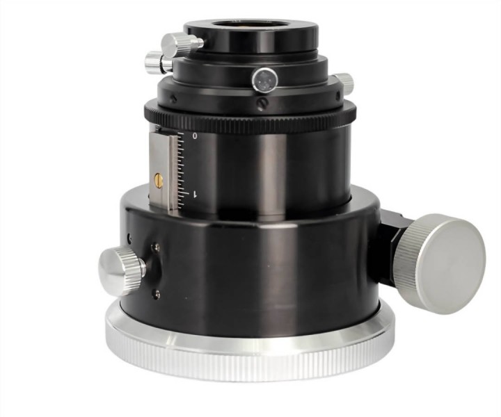 Der Okularauszug passt direkt an das M117x1-Gewinde der größeren RC- und Cassegrainteleskope ab 10" Öffnung. Er hält Zubehör bis 6 kg und ermöglicht durch die Kombination aus Rollenlagern und Zahntrieb eine saubere Verstellung ohne Verkippung, auch bei maximaler Belastung. Die Basis an der Verstellseite ist eben und mit zwei M4-Innengewinden ausgestattet, damit kann ein Motorfokus wie der EAF von ZWO ohne Hilfsadapter montiert werden.