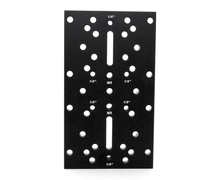 - 2 Langlöcher mit je 38 mm Länge für 1/4"-Schrauben und M6-Schrauben