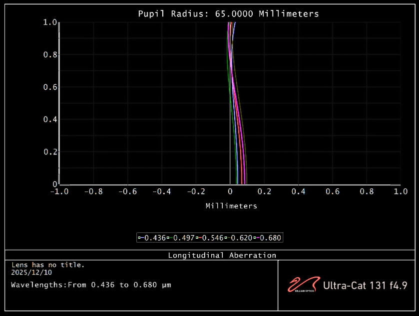 | Technische Daten | Objektivtyp 5-Element Advanced Petzval Linsenelemente Super-ED-Glas x2, ED-Glas x1, Lanthan-Glas x1, X-Element x1 Brennweite 648 mm Durchmesser 131 mm Brennweite f/4,9 Bildkreis 60 mm Fokussierer WIFD R&P-Fokussierer, kompatibel mit EAF Fokussierweg 0–20 mm Adapter im Lieferumfang enthalten Sensor-Neigung Xterminator-Rotator, M68-, M54-, M48-Kameraadapter Optionaler Flattener Kein Flattener erforderlich T-Mount-Unterstützung Canon EF, RF, Nikon F, Z, Sony E, Pentax K, MFT (M4/3), FUJI X Kameraformat Mittelformat, Vollformat, APS-C, M4/3 Schwalbenschwanztyp Losmandy Tubuslänge 650 mm – 785,5 mm OTA-Gewicht 9,95 kg / 21,94 lbs