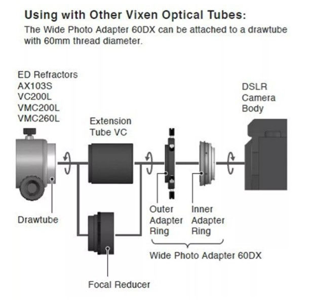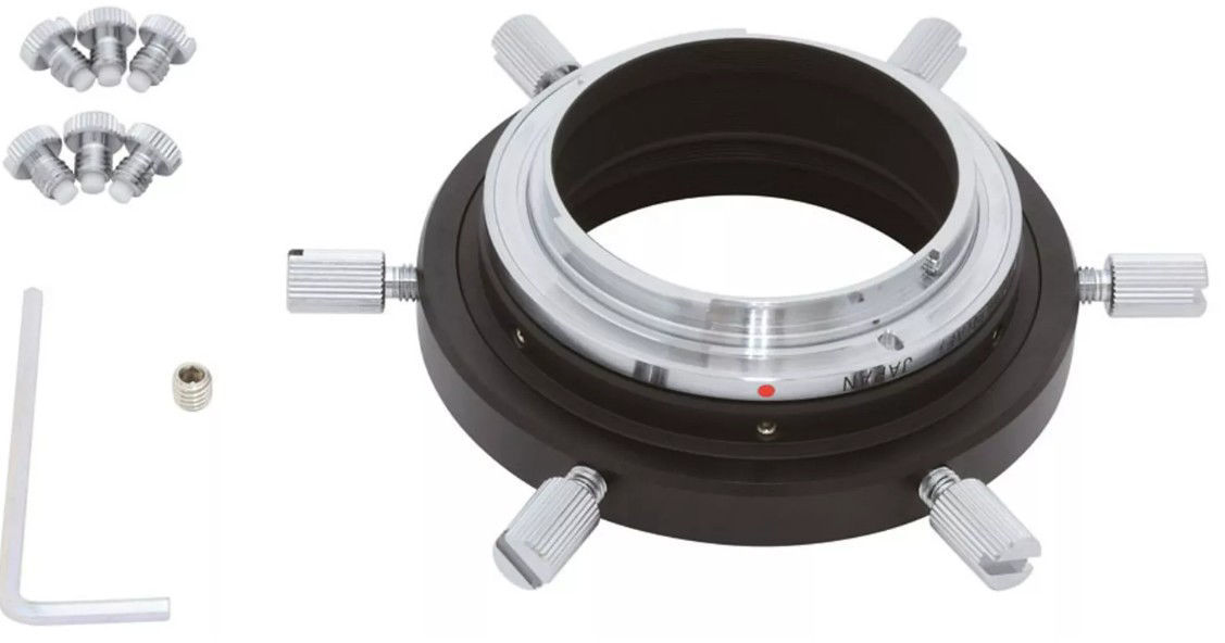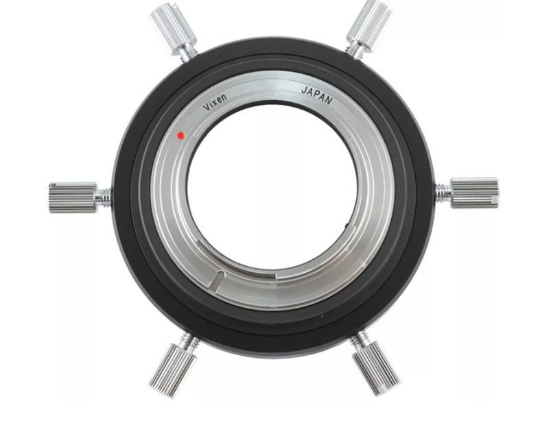 Der Vixen 60DA Fokaladapter verbindet Ihre Canon EF-DSLR-Kamera durch ein 60-mm-Gewinde mit Ihrem Teleskop. Dank der Verwendung neuer Materialien und einer verbesserten Bauform konnte Vixen die Präzision und Belastbarkeit gegenüber herkömmlichen Adaptern wesentlich verbessern. Der große Innendurchmesser des Adapters verhindert bei Vollformat-DSLR-Kameras eine Abschattung an den Rändern.