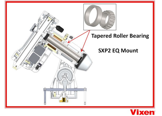 Für die neue SXP2 Montierung wurden größere Kugellager als bei den Vorgänger Modellen eingebaut um die Genauigkeit und Tragkraft zu erhöhen. Das Montierungs-Gehäuse hat eine höhere Materialstärke als die bisherigen SX Montierungen. Das Achsenkreuz wird fest in eine Gabel eingeklemmt um eine noch höhere Stabilität des Polblocks zu erreichen.