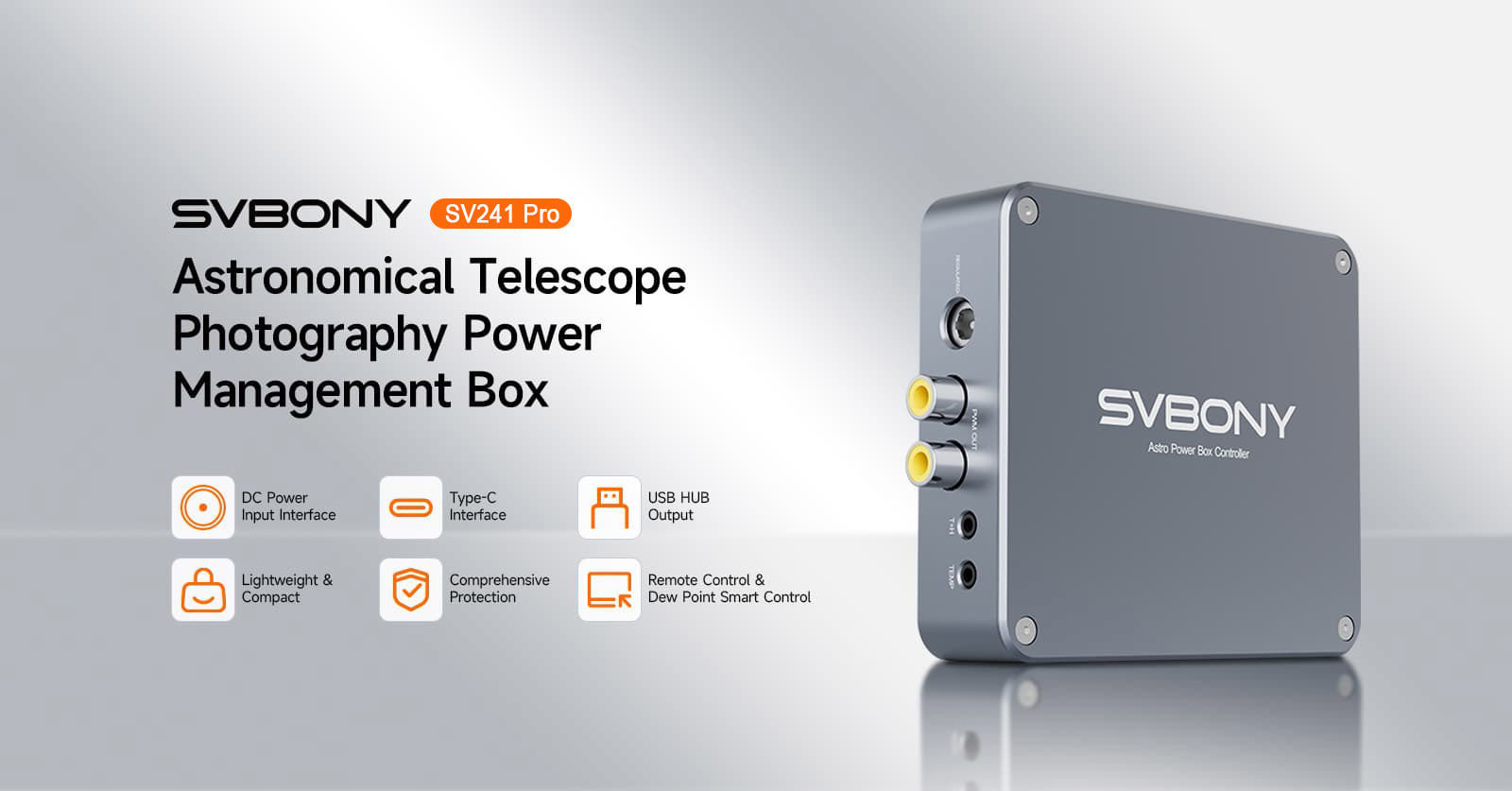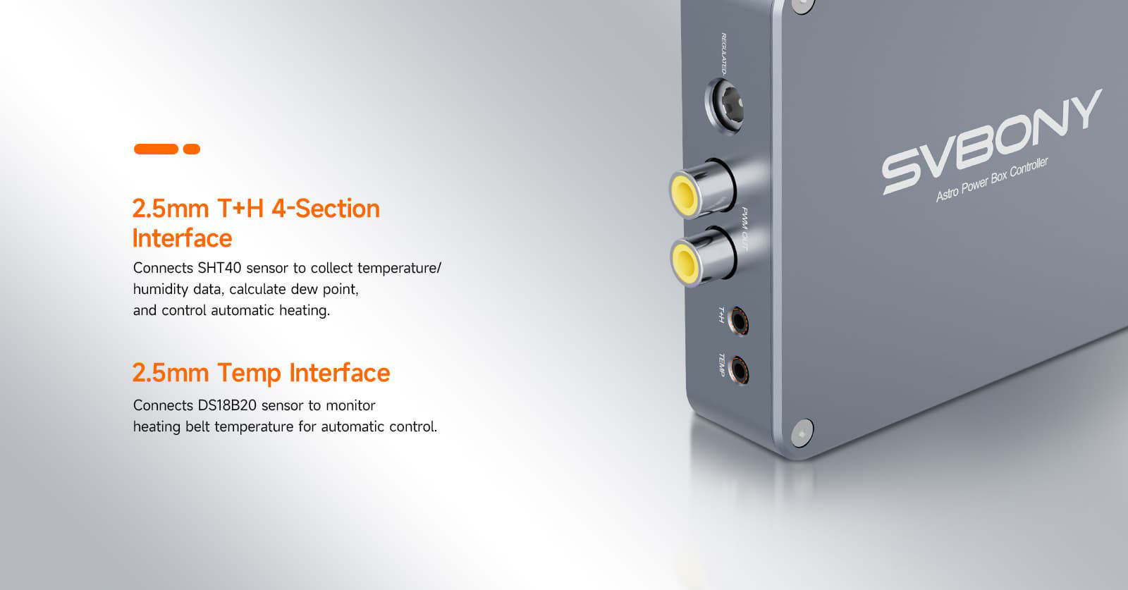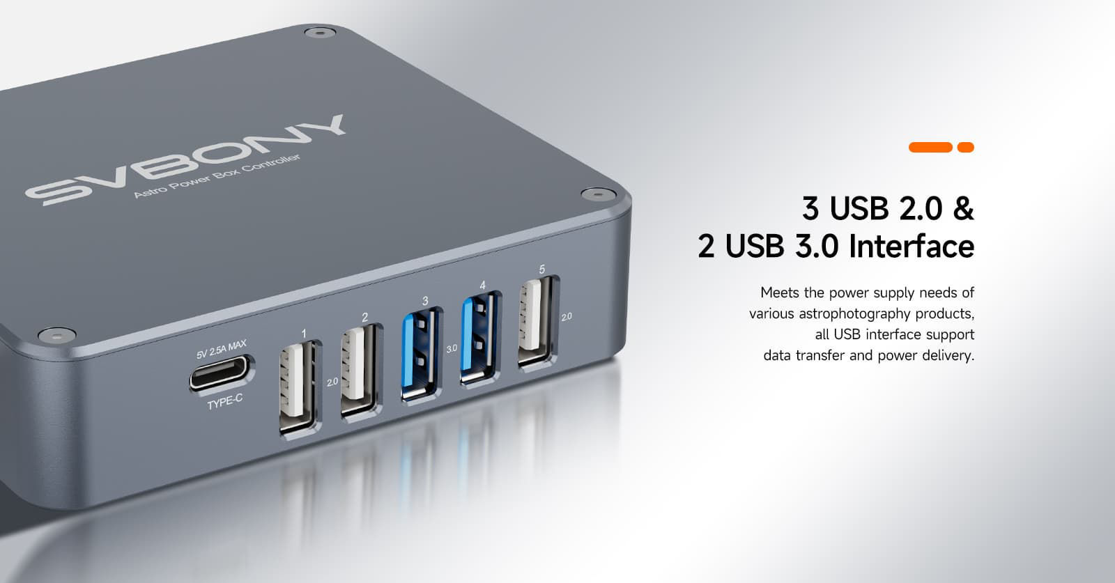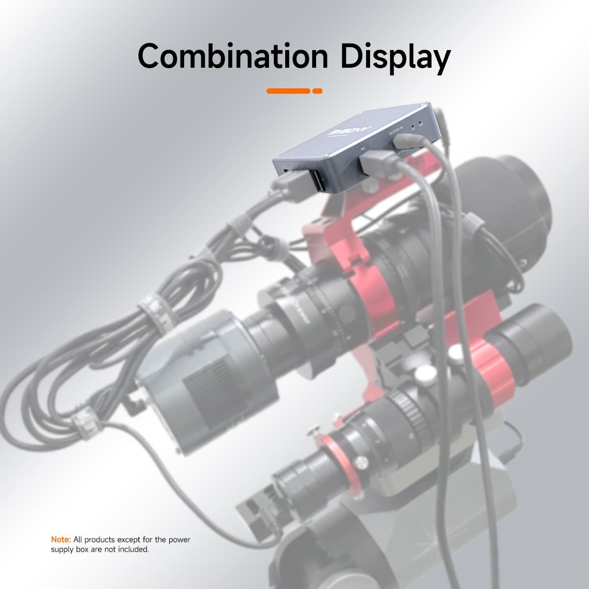 Der USB-Anschluss kann mit Guiding-Kameras, Planeten-Kameras usw. verbunden werden; der DC-Anschluss unterstützt DSO-Kühlkameras, Montierungen, elektronische Fokussierer, motorisierte Filterräder und elektronische Flattener; die PWM1-2 Ports dienen zum Anschluss von Taukappenheizungen.