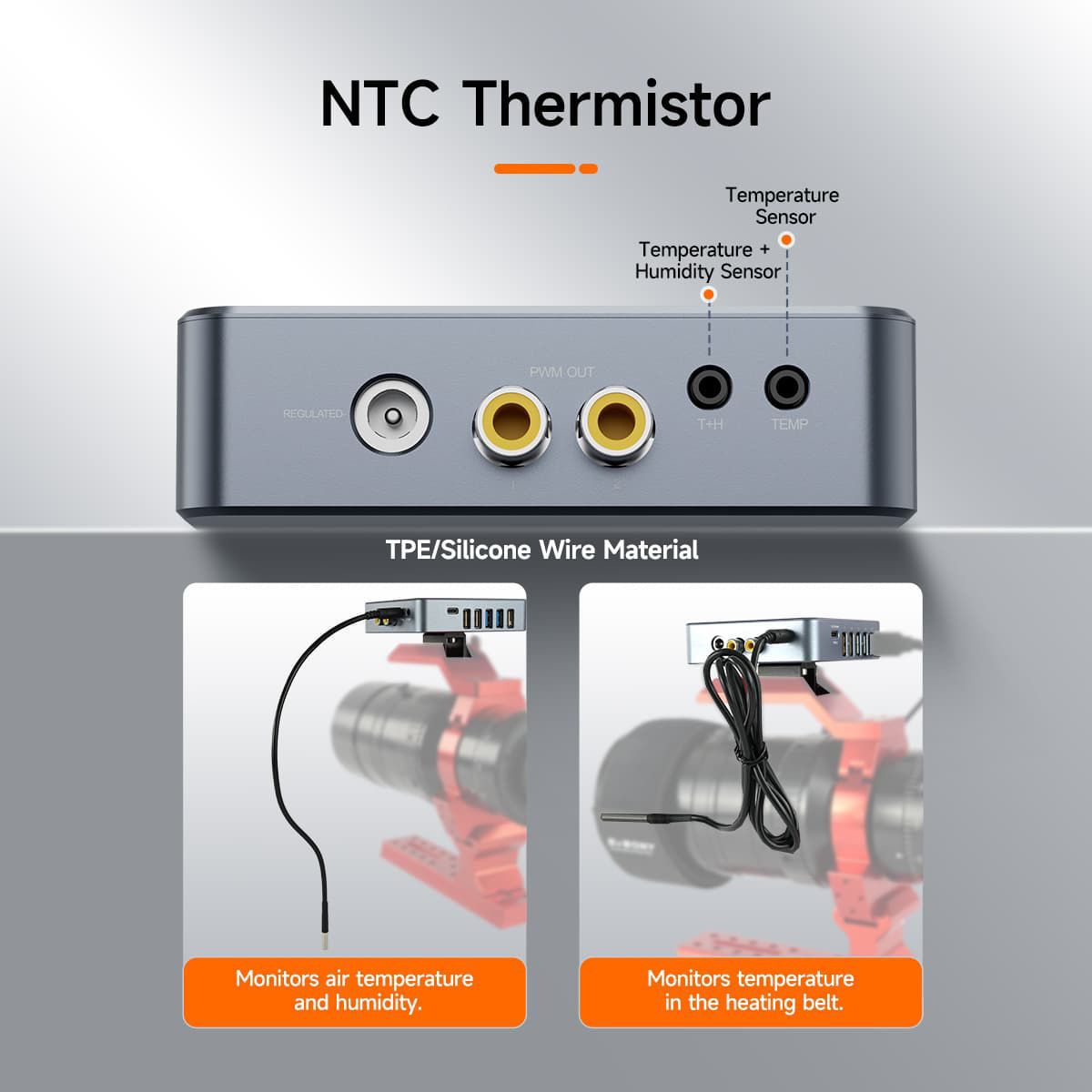 - Ausgestattet mit einer T+H-Schnittstelle zur Erfassung von Luftfeuchtigkeit (5 % – 85 % relative Luftfeuchtigkeit), zur Berechnung des Taupunkts und zur Steuerung der Heizung; die Temp-Schnittstelle überwacht in Echtzeit die Temperatur von Heizbändern (-10°C bis 50°C) für präzise Temperaturregelung und Tau-Schutz.