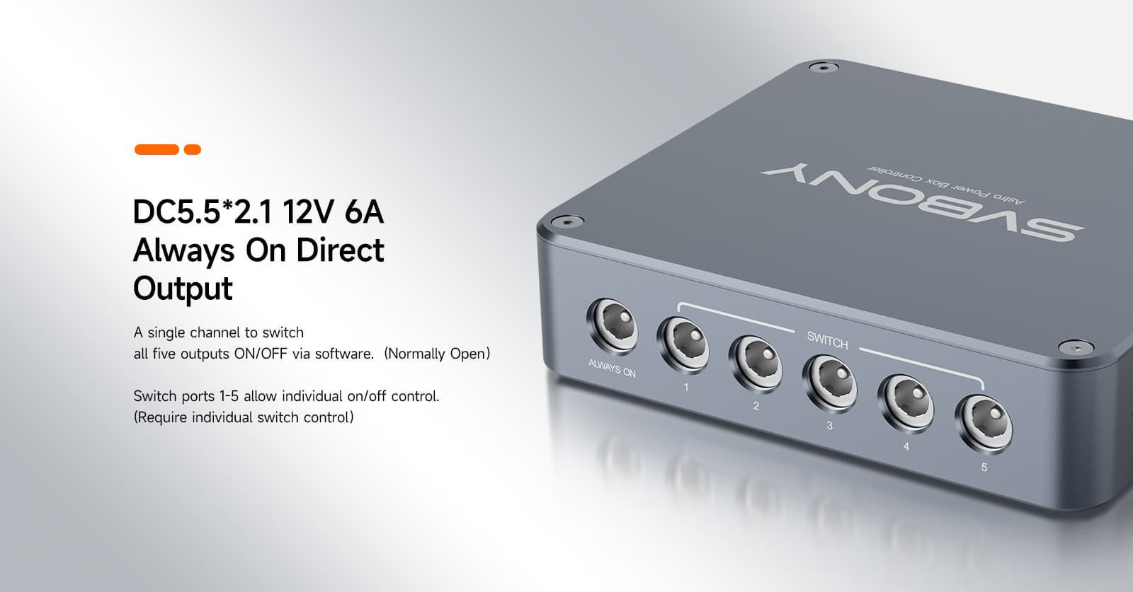 - 7x 12V DC-Ausgänge, regulierte Schnittstellen, und die Schalter-Interfaces 1-5 sind einzeln ein- und ausschaltbar;