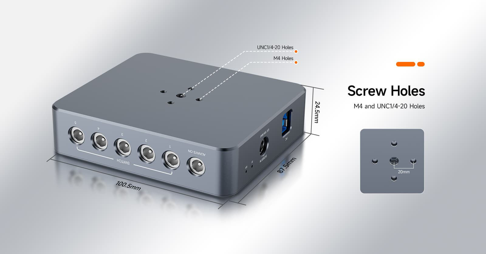 Die Stromversorgungsbox ist mit UNC1/4-20- und M4-Gewindebohrungen ausgestattet, um verschiedenen Montageanforderungen gerecht zu werden und lockere Verbindungen sowie Stromausfälle durch Bewegung, Erschütterung oder Herunterfallen während der Astrofotografie zu verhindern.