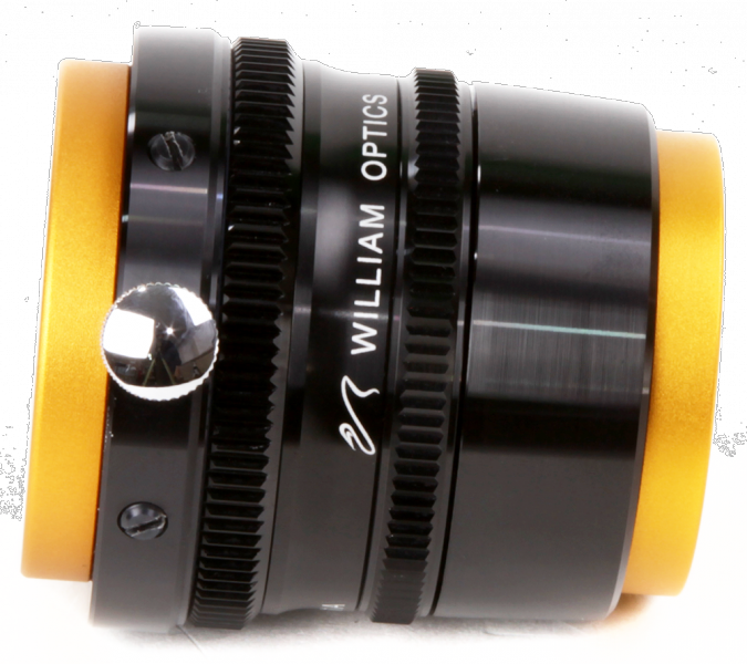 Montage: Der Flattener wird fest auf das Gewinde des Okularauszugs geschraubt. Schrauben Sie dazu so wie im Bild rechts gezeigt einfach das farbig eloxierte Endstück ab. Dieses Endstück dient der Aufnahme einer Steckhülse, wird aber bei der Verwendung eines Flatteners nicht mehr benötigt. Heben Sie es gut auf, für den Fall, dass Sie die Optik visuell mit einem Zenitspiegel nutzen möchten. Der Flattener kann dann einfach in das Gewinde des Okularauszugs eingeschraubt werden.