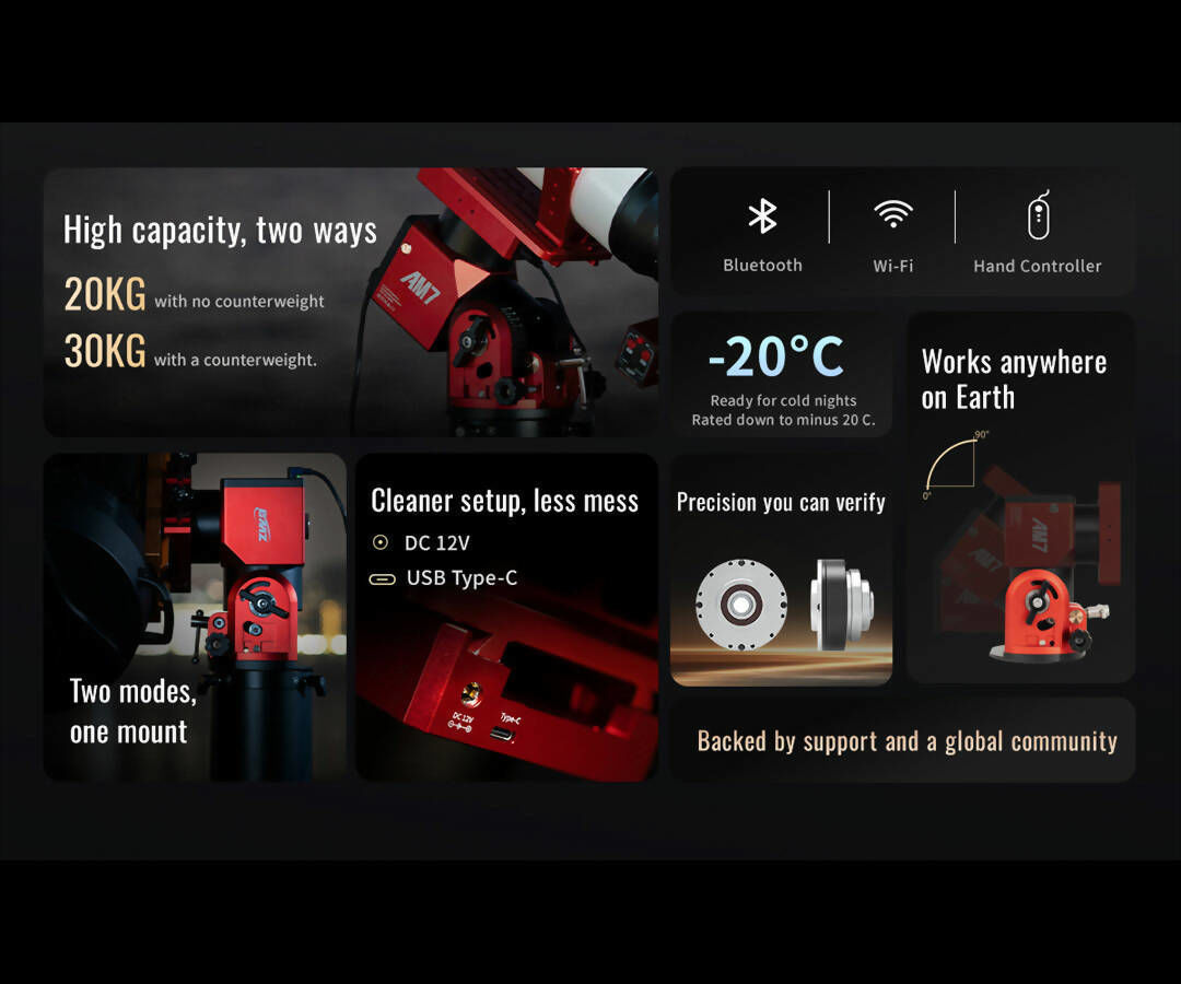 - Eine Montierung für die lange Strecke: Die AM7 eignet sich sowohl für kleine als auch für schwere Aufbauten, sodass Sie auf größere Teleskope umsteigen können, ohne dass Ihre Montierung zu klein wird.