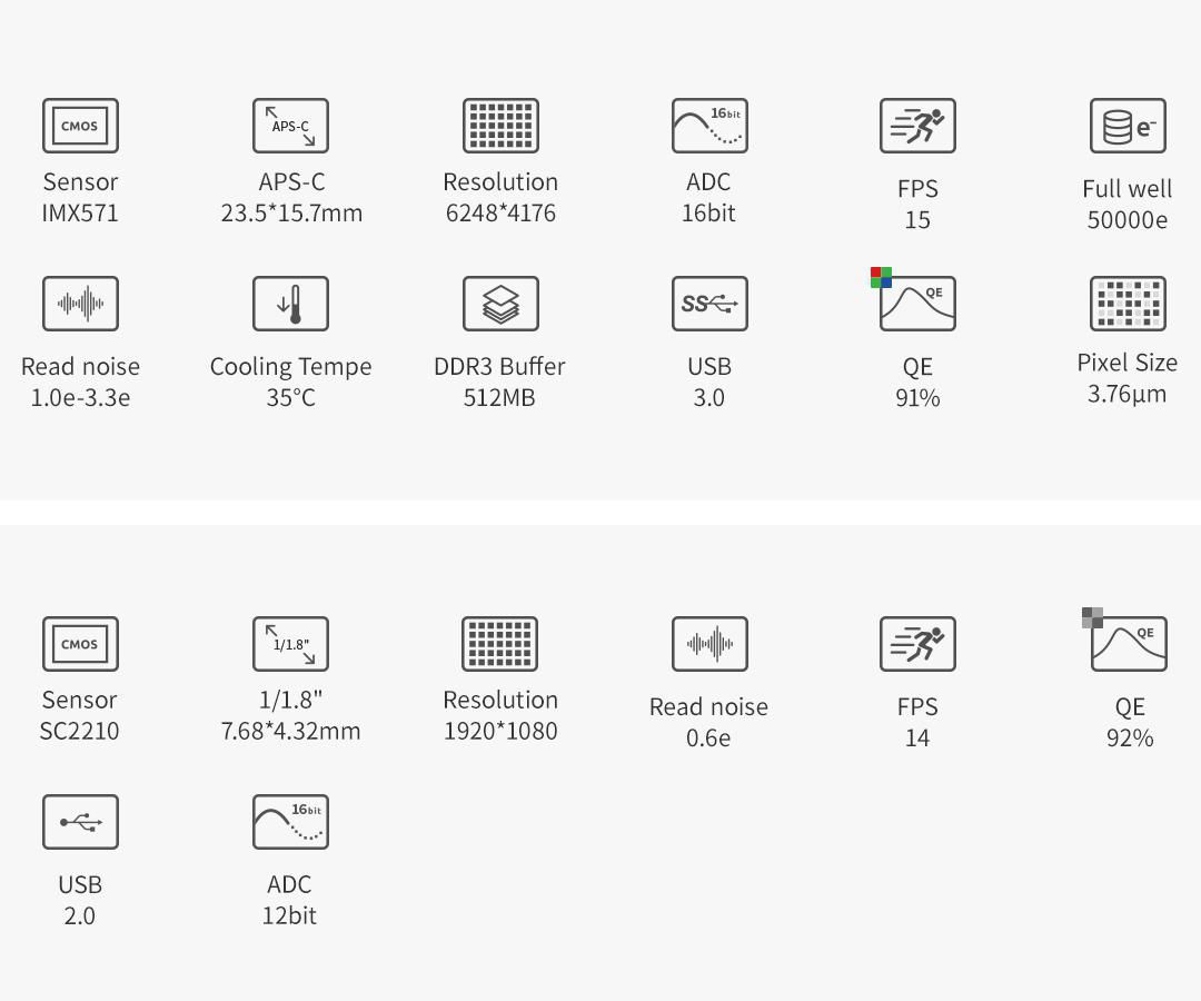 Der aus der ASI220MM Mini-Kamera übernommene SC2210-Sensor zeichnet sich durch eine sehr hohe Empfindlichkeit aus. Der QE-Spitzenwert erreicht 92 % bei 500 nm. Das Ausleserauschen liegt bei nur 0,6 e. Als die neue Generation des Guidingsensors hat er großartige Ergebnisse bei der Nachführung erzielt, die von Hunderten von Astrofotografen bestätigt wurden.