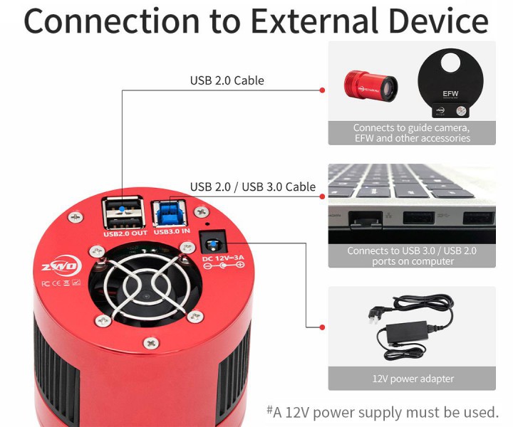 Diese Kamera benötigt auch im ungekühlten Betrieb 1 Ampere, was für USB-Buchsen an Computern ein Problem darstellt, denn die sind nur für 900 mA, also 0,9 A ausgelegt.
