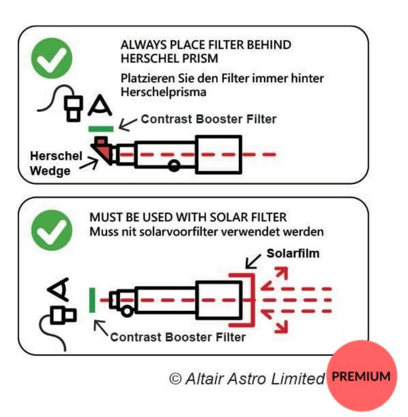 Bitte beachten Sie: Dieser Filter ist für die Verwendung mit einem sicheren, professionellen Helligkeitsreduktionsfilter wie EMC Filter mit ND3.8 (*) (Reflektoren und Refraktoren) oder Herschel Keil (nur Refraktoren) vorgesehen.