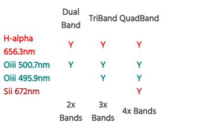 - Quad-Band - kombiniert Sii UND Ha zu einem roten Bereich und H-beta + Oiii zu einem grünen/blauen Bereich. (Für vorstädtische / moderate Lichtverschmutzung).