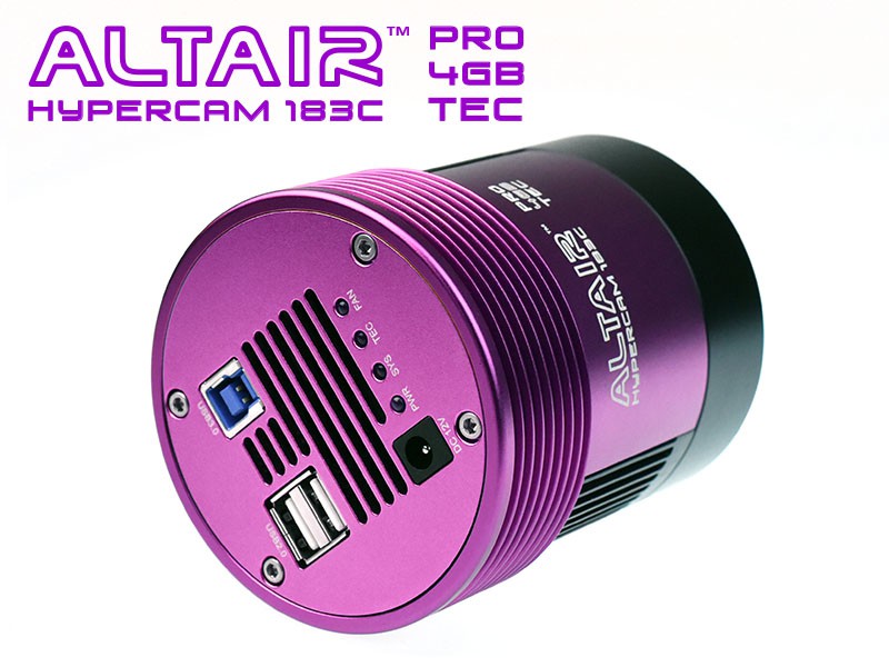 Altair Hypercam 183M PRO TEC Monochrome 20mp Astronomy Imaging Kamera mit 4GB DDR3 RAMIn dieser Kamera wurde der SONY Exmor R BSI IMX183 Monochrome CMOS sensor verbaut. Der Chip hat eine Auflösung von 5440x3648 Pixel, also fast 20 Millionen Pixel. Was die Pixelanzahl angeht, zählt die CMOS Kamera zu den größten Kameras, die zur Zeit angeboten werden. Die Kamera kann auf maximal 45° unter Umgebungstemperatur gekühlt werde. Aufgrund des sehr geringen Verstärkerglühens eignet sich die Kamera bestens für astronomische Anwendungen. Durch die Back Illumination Technik ist der Chip extrem Lichtempfindlich. Die Kamera ist mit einer USB3 +USB2 Schnittstelle ausgestattet. Eine Autoguider Schnittstelle ist natürlich vorhanden. Eine passende Software ist im Lieferumfang enthalten. Mit dem Kauf dieser Kamera erhalten Sie auch eine Benutzerlizenz für das Programm SharCap 3.0 + auf 1 Jahr beschränkte Software SharCap PRO (ein Programm mit vielen Features speziell f. Astrofotografie).