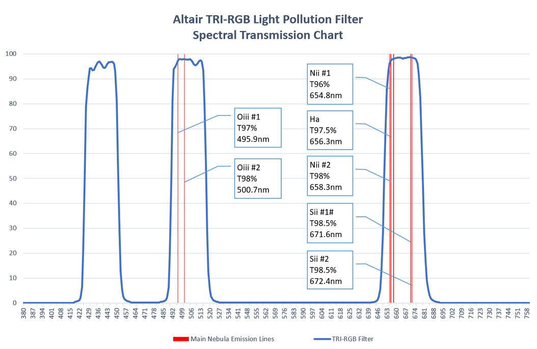| Technische Daten | Altair TRI-RGB Filter Transmission Characteristics| Wavelength: | Oxygen iii #1 | Oxygen iii #2 | Hydrogen Alpha | Sulphur ii #1 | Sulphur ii #2 | | Transmission:* | 97% | 98% | 97.5% | 98.5% | 98.5% | * Toleranz etwa 1% - OD4/5 Blockierung (0,01%~0,001%) bei der Mehrheit der unerwünschten visuellen Wellenlängen