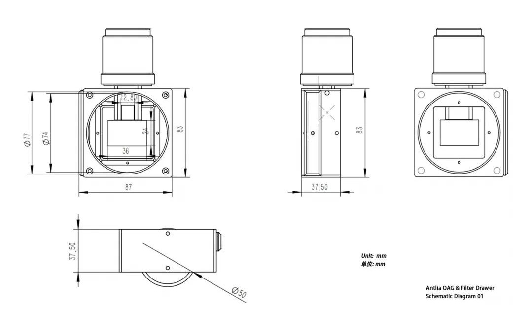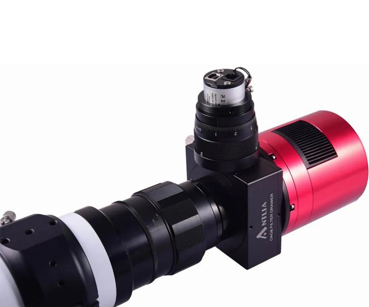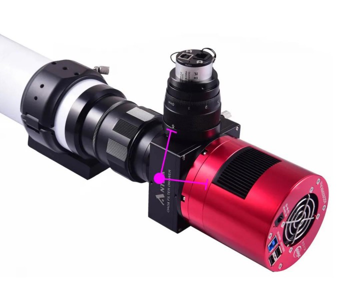 Die Antlia OAG- und Filterschubladenkombination ist ein innovatives Zubehör, das eine Filterschublade und einen OAG (OAG steht für Off-Axis Guider) integriert. Damit können Sie Ihr primäres Aufnahmeteleskop für die automatische Nachführung verwenden, ohne ein zusätzliches schweres Leitteleskop zu benötigen. Der OAG verwendet ein kleines internes Ablenkprisma als Spiegel, um einen Teil des vom Teleskop einfallenden Lichts auf die unabhängige Nachführkamera zu reflektieren. Da die Nachführkamera und die Aufnahmekamera denselben Bildweg benutzen, kommt das System sehr gut mit allen Krümmungen und Neigungen zurecht, die in Ihrem Aufbau auftreten können, und Sie erreichen eine höhere Nachführgenauigkeit als mit einem separaten Leitfernrohr.