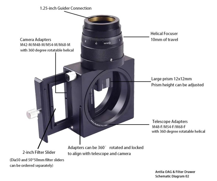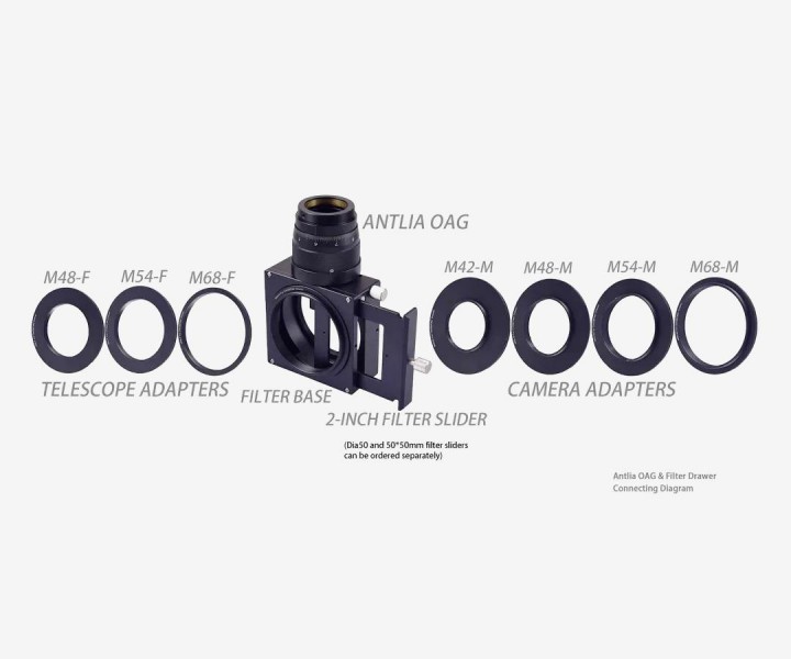 - Eine große Auswahl an Adaptern wird angeboten, um verschiedene Konfigurationen zu ermöglichen. Antlia OAG umfasst 7 gängige Gewindegrößen: M42, M48, M54, und M68 mit Außen- und Innengewinde für beide Seiten. (kein M42-Innengewinde)