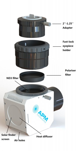 Das APM Herschelkeil ist mit der Keramik Lichtfalle, einem multivergütetem integriertem ND3 Filter und (austauchbarem) multivergütetem Polfilter ausgestattet. Diese Anordnung macht die Sonnenbeobachtung mit einem Herschelkeil zu einer sicheren Sache. Die Bildhelligkeit kann durch Verdrehen des Polfilters reguliert werden. Damit ist der Herschelkeil sowohl visuell als auch fotografisch einsetzbar! Die Anwendung des Herschelprismas (im Vergleich zum Folienfilter) für Sonnenbeobachtung ist nicht nur sicherer, sondern auch qualitativ besser. Das erzeugte Bild ist kontrastreich und scharf und kann damit auch hoch vergrößert werden.