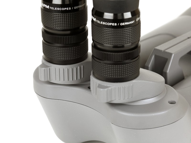 Unsere 82mm SD-Apo Ferngläser bieten hohe Leistungsfähigkeit im mittleren Größenbereich. Das 2-linsige apochromatische Optikdesign bildet sehr sauber ab und ist auch höher vergrößerungsfähig. Zum hohen Kontrast und exzellenter Bildhelligkeit trägt auch die hochmoderne Multivergütung bei. Dank des standardmäßigen 1¼" Okularanschlusses lassen sich viele Weitwinkelokulare problemlos nutzen! Dies eröffnet die Möglichkeit zur Beobachtung sowohl der Planeten und des Mondes als auch ausgedehnter Sternfelder und Nebelregionen. Der Augenabstand ist feinfühlig einstellbar, die Okulare werden einzeln fokussiert. Zur besseren Tragbarkeit wurde das Gehäuse aus einer Magnesium Legierung gefertigt. Das Gehäuse ist zudem wetterfest.
