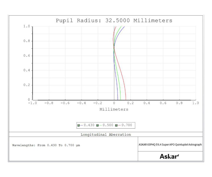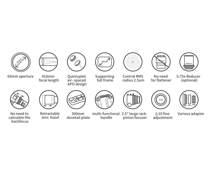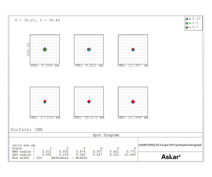 Der 65PHQ ist kleiner als andere PHQ-Astrographen. Der 65PHQ hat ein Öffnungsverhältnis von 1:6,4 und eine Brennweite von 416 mm. Anstelle des Quadruplet-Aufbaus anderer PHQs ist der 65PHQ ein Quintuplet mit zwei ED-Gläsern, was eine hervorragende Kontrolle chromatischer und anderer Aberrationen ermöglicht. Mit seinem selbstebnenden Design bietet der 65PHQ starke Vorteile bei astronomischen Aufnahmen. Er unterstützt den Vollformat-Bildkreis und verfügt über ein feines Spot-Diagramm mit nur winzigen Verzerrungen der peripheren Sterne.