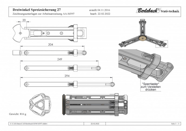 Mit dieser verstellbaren Spreizsicherung können Sie die Beinspreizung Ihres Statives in drei festen Winkeln (bei ca. 24, 32° und 40°) sicher arretieren. Ein Nachinnenschwenken der Beine wird ebenso verhindert. Das Besondere einer variablen Spreizsicherung dabei ist, dass Sie von der minimalen bis zur maximalen Aufstellhöhe des Stativs nahezu immer das gleiche Beindreieck haben. Dies ermöglicht eine flexible Nutzung des Stativs mit verschiedenen Aufbauten. Diese Spreizsicherung wird für das Stativ Planet empfohlen. Die Bedienung erfolgt von der Unterseite. Ein leichter Druck auf den sogenannten Sperrtaster bei gleichzeitigem Ziehen (Winkelvergrößerung) oder Drücken (Winkelverkleinerung / Transportstellung) am Stativbein und Sie erreichen eine andere Winkelposition. Die Ablageplatte kann auf die Spreizsicherung aufgeschraubt werden. max. Zuladung: 10 kg