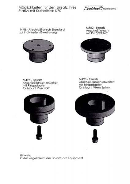 Unser neuer Schenkelkopf für den Astronomiebereich erlaubt eine leichtgängige Höhenverstellung von Lasten bis 50 kg. Durch die Getriebemittelsäule (Ø 70 mm) lassen sich Montierungen oder Großferngläser leicht und sicher in der Höhe (35 cm) anpassen. Die bewährten Astro-Stative der Modellreihe UNI zeichnen sich vor allem durch ein sehr gutes Preis-Leistungsverhältnis aus. Der Spreizwinkel beträgt 24° bei nicht verstellbarer Spreizsicherung. Lieferung incl. Spreizsicherung (wahlweise Ringspreize, variabel oder nicht verstellbar). Bei den Spreizsicherungen variabel und nicht verstellbar ist eine Ablageplatte im Lieferumfang, bei Ringspreize nicht. Der größte Vorteil einer variablen Spreize: über den gesamten Arbeitsbereich, von minimaler Aufstellhöhe bis zum Maximum, hat man stets einen optimalen, relativ gleichen Aufstellradius (Beindreieck). Bei allen Kurbelstativen kann man diesen sogar fast konstant halten. Das heißt: Beinauszugslänge und Strebenauszugslänge der Spreize in den 3 Stufen legt der Anwender vor der Nutzung der Optik fest und hat dann über den Säulenhub seine variable Höhe. Ab Januar 2022 gibt es zwei Varianten zur Befestigung Ihres Equipments an der Mittelsäule. Basis ist immer der Anschlußflansch, welcher wenn erforderlich, mit einem zusätzlichen Adapter passend für Ihr Equipment erweitert werden kann (nähere Informationen s. Link unten). Lieferung erfolgt incl. Ausdrücker. Andere Gewinde und Anpassungen auf Nachfrage möglich. .