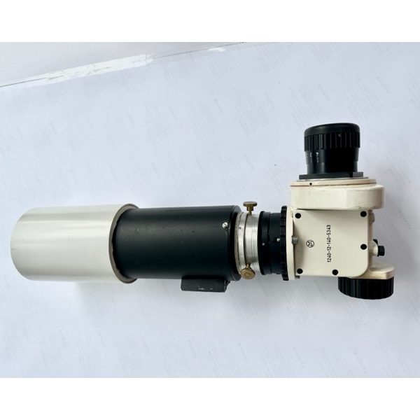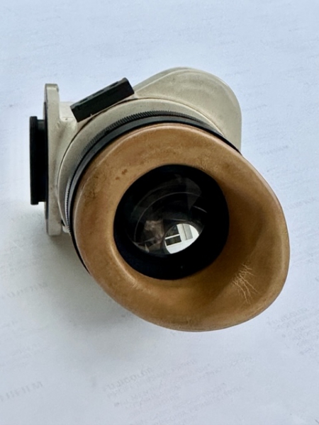 Deutsches Panzerokular mit 90° Dachkantprisma als 80 mm Sucher. Deutsches Panzerokular mit Dachkantprismengehäuse, Vergütung und Glasflächen im Topzustand, inklusive einschwenkbarer Gelbfilter. Mit dabei ist ein 80 mm Achromat Tubus , sodaß hier ein kompletter Sucher zusammen gefügt ist.